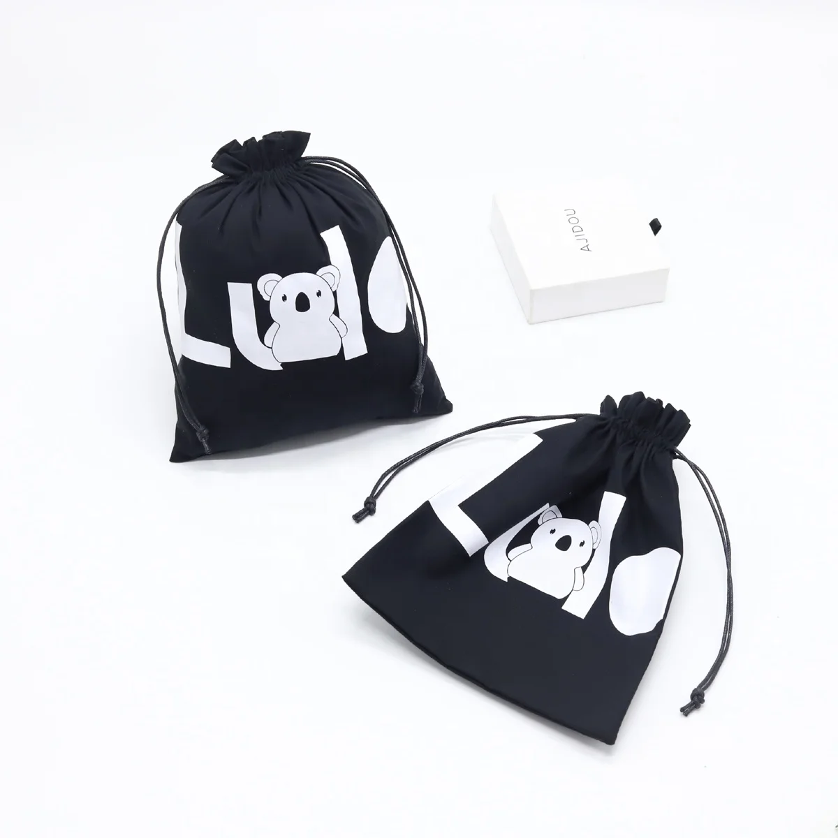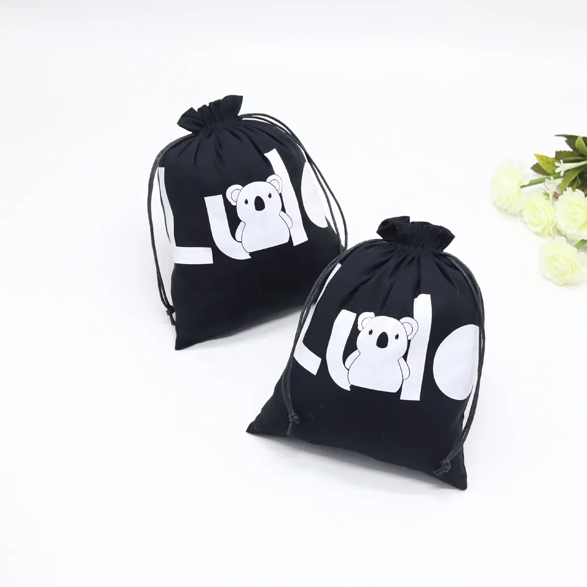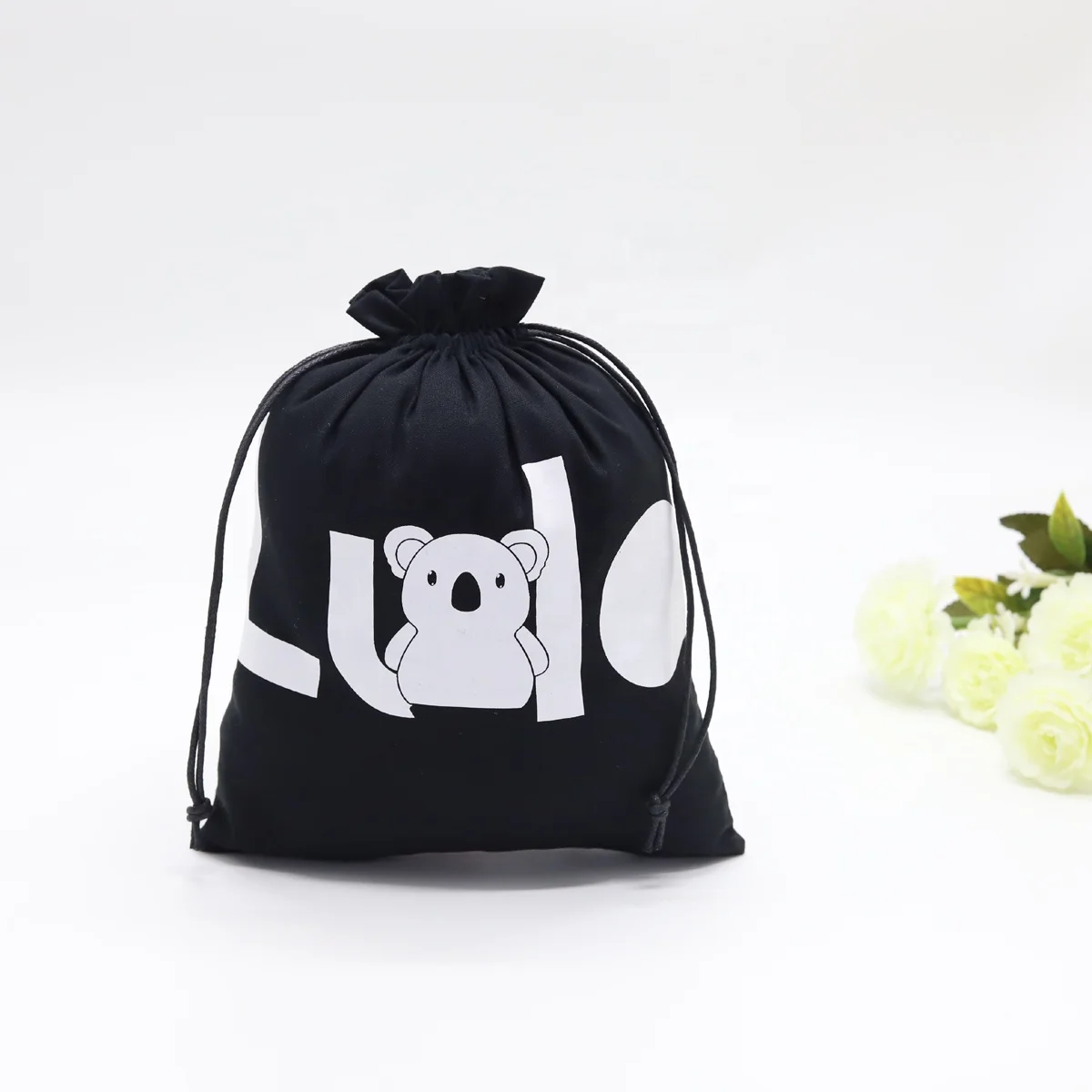 Item Name: | Custom White Logo Organic Cotton Drawstring Child Shoe Pouch Soft Black Packaging Dust Shoe Bag |