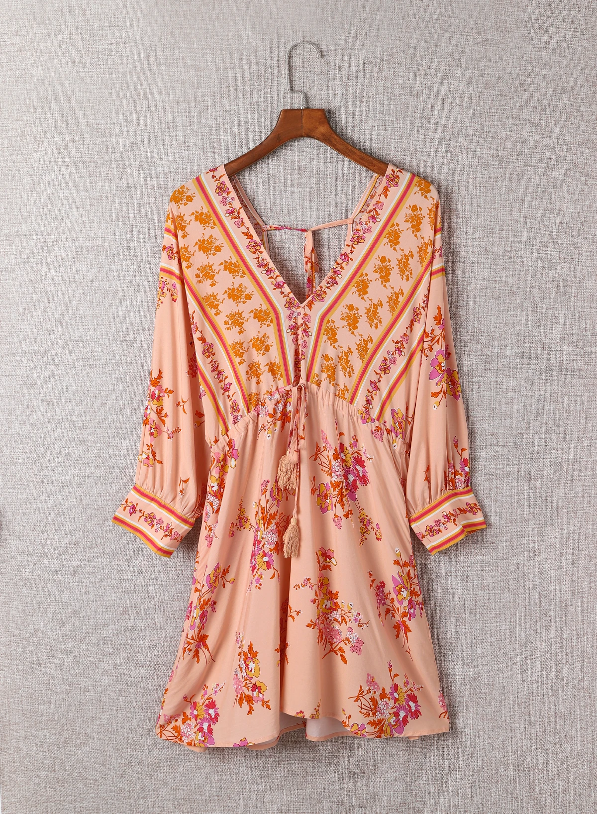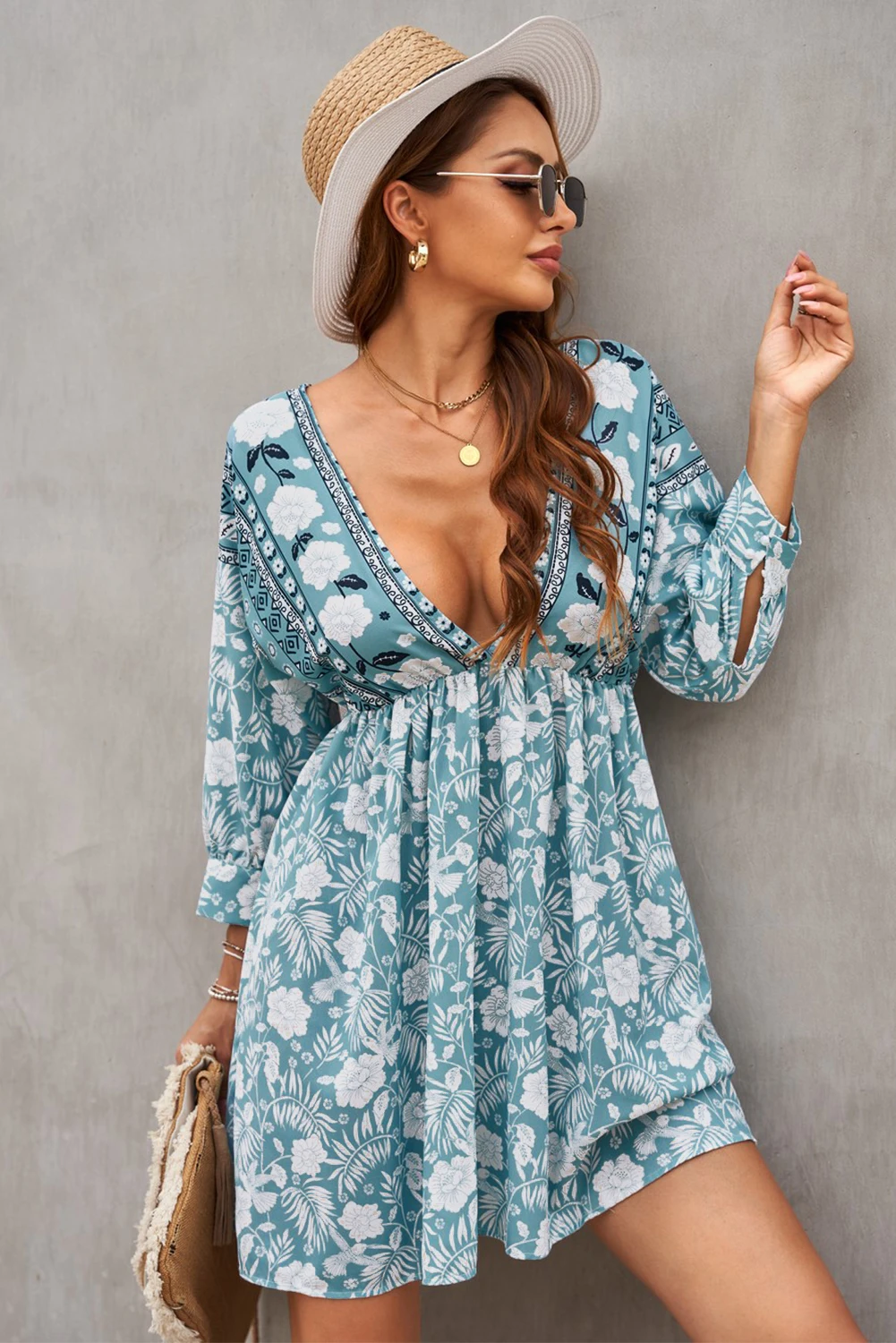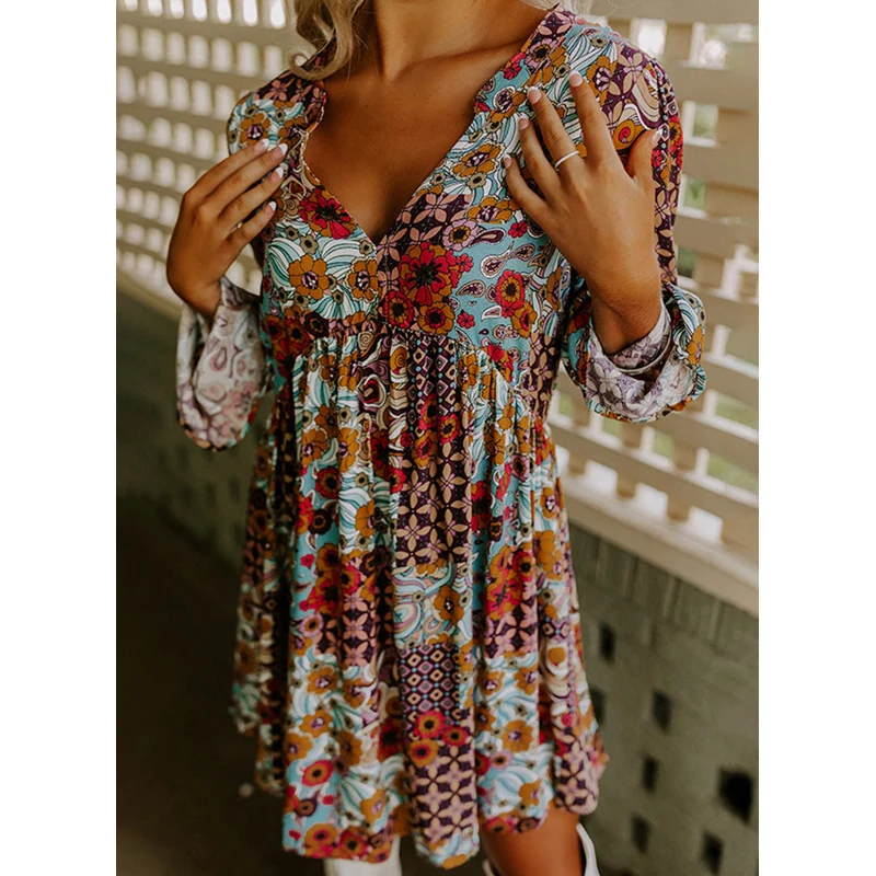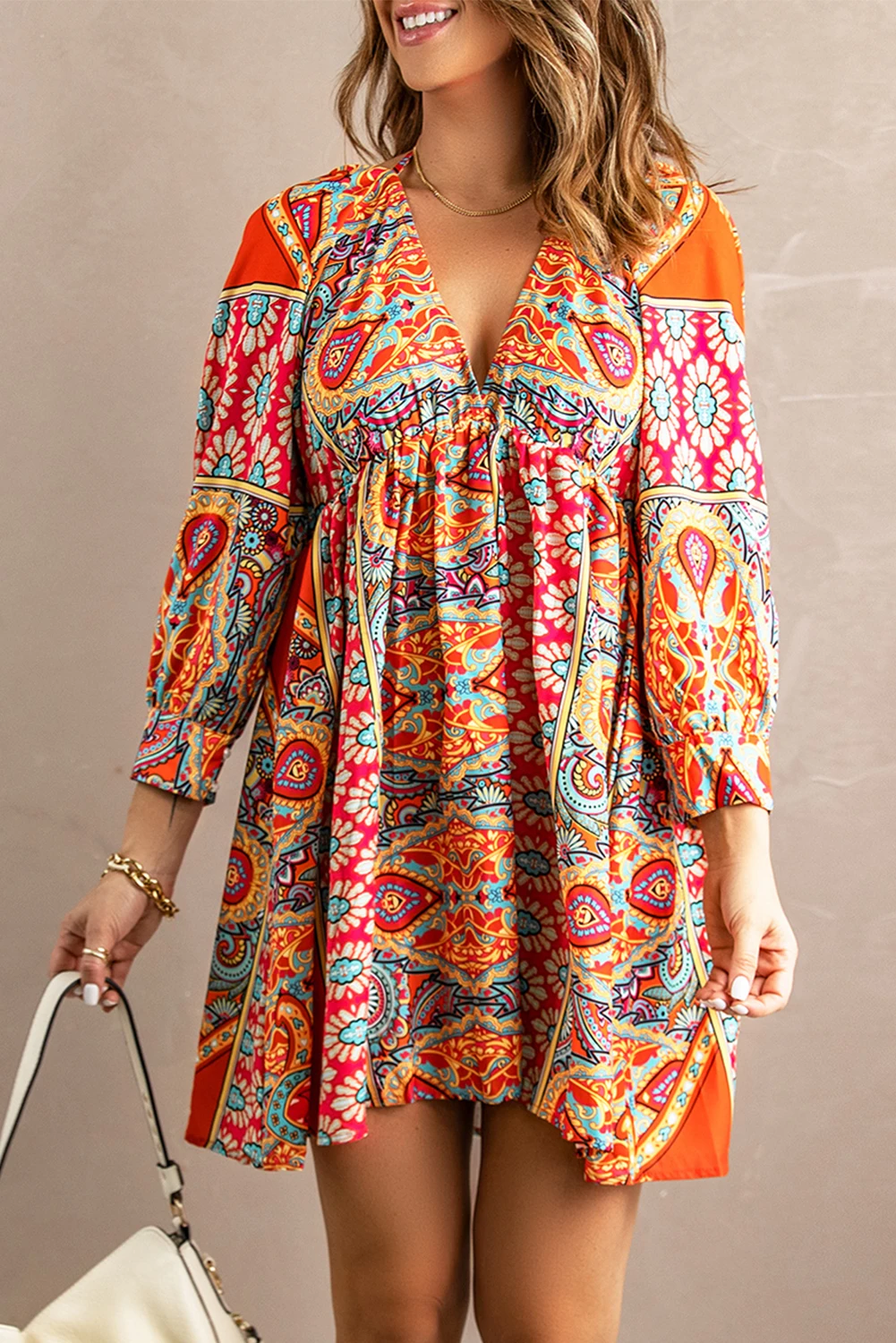 Multicolour V Neck 3/4 Sleeve Bohemian Vintage Print Mini Dress