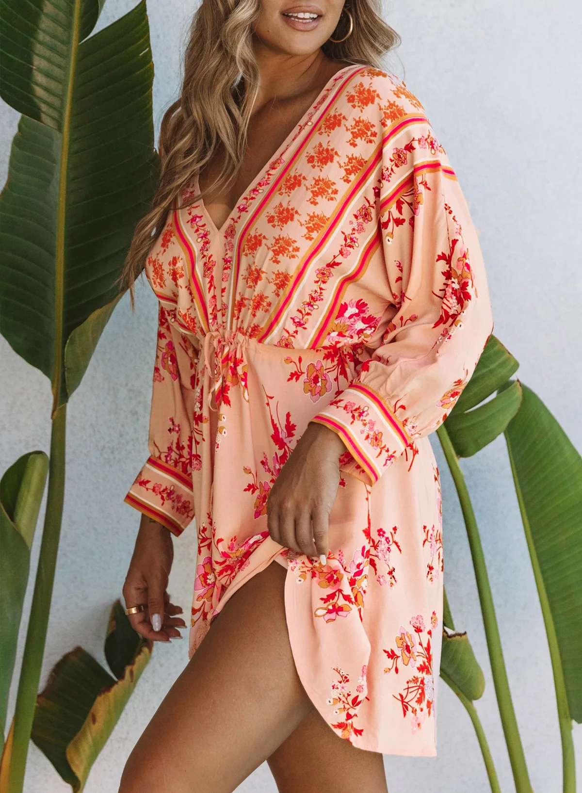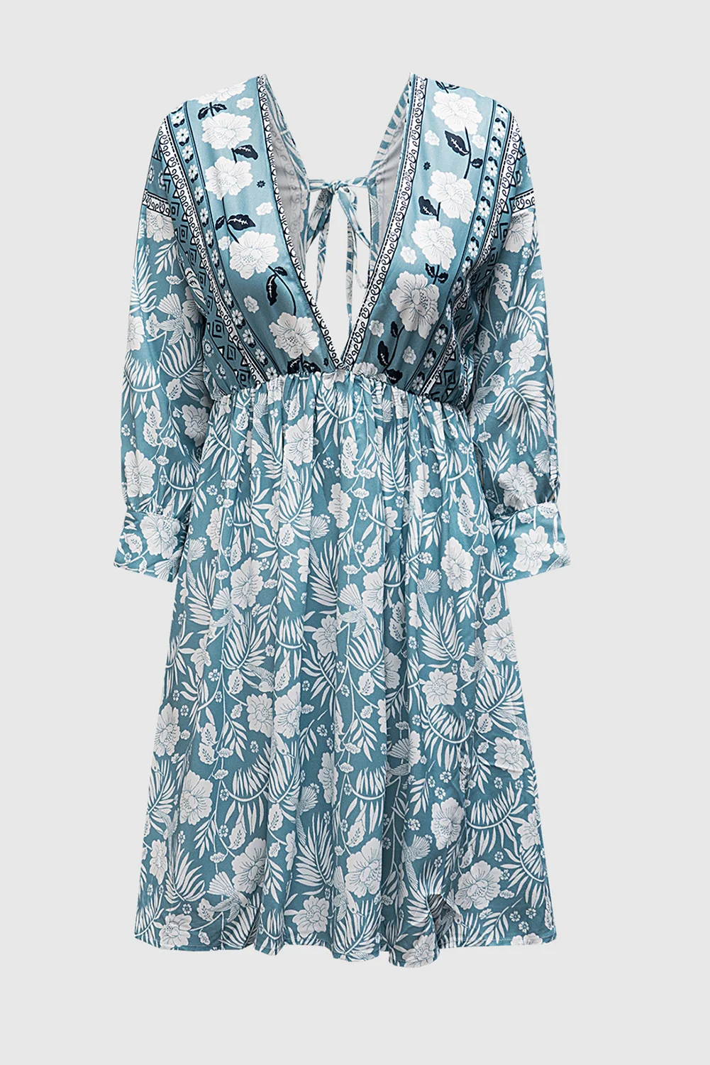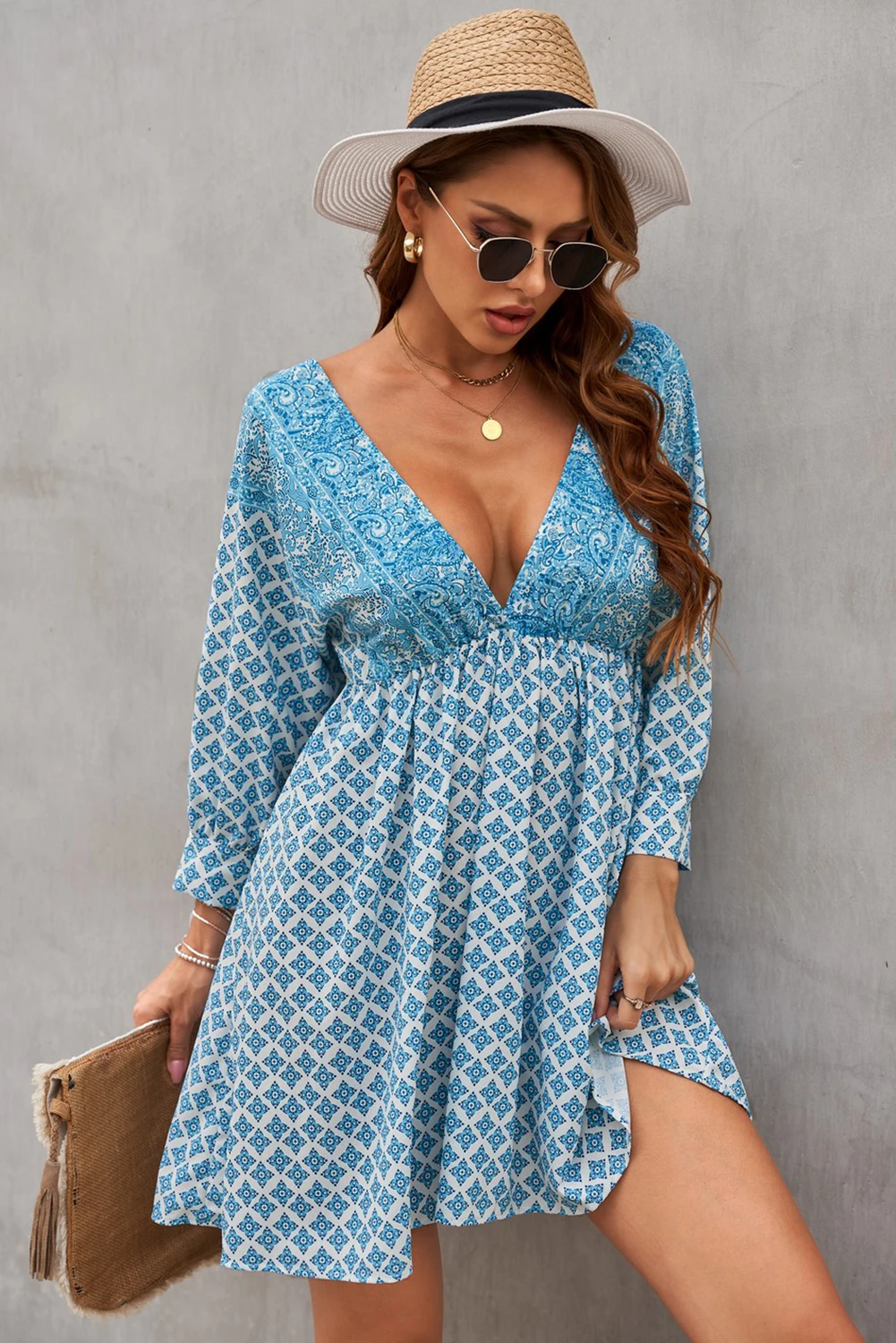 Multicolour V Neck 3/4 Sleeve Bohemian Vintage Print Mini Dress