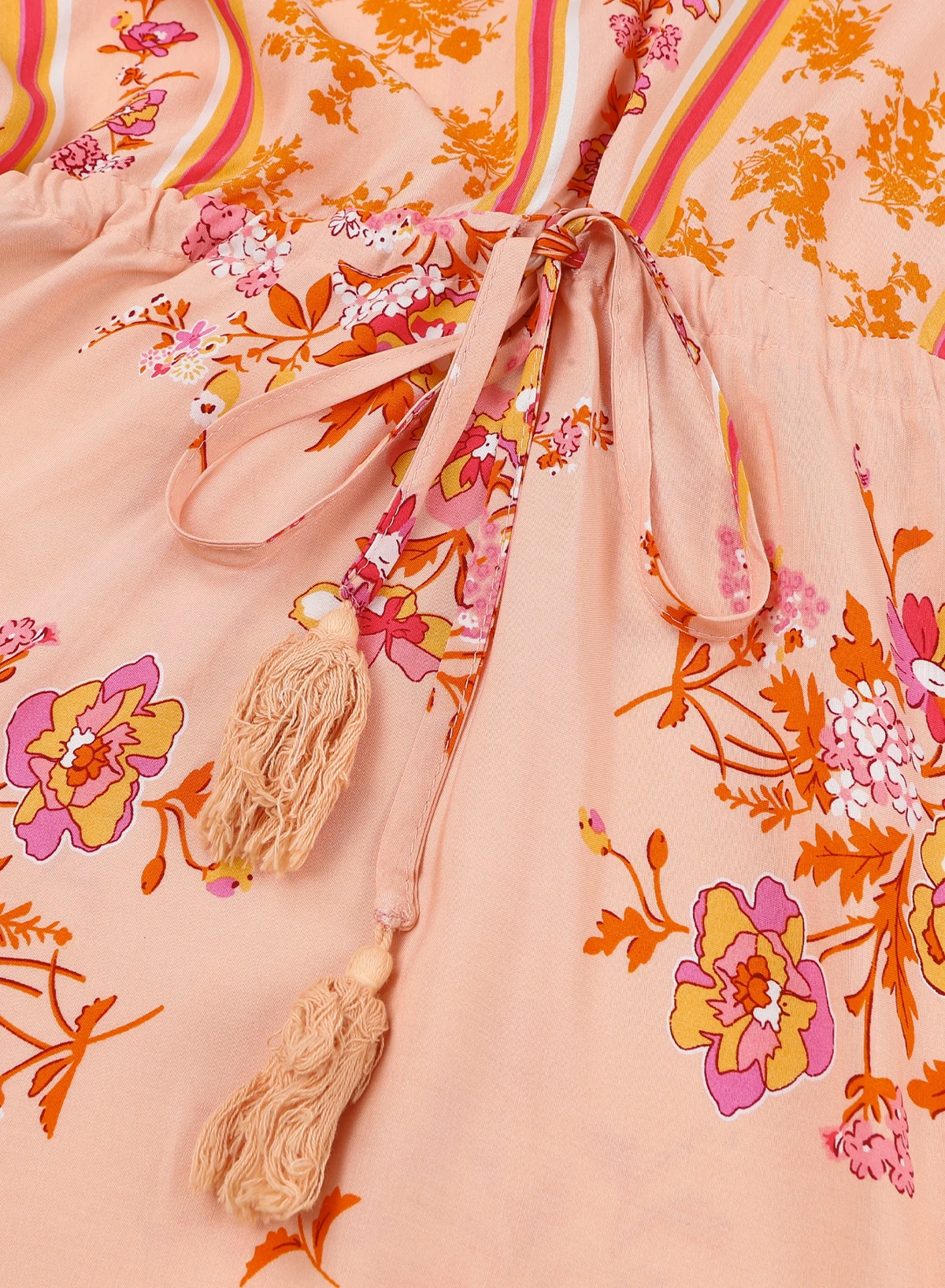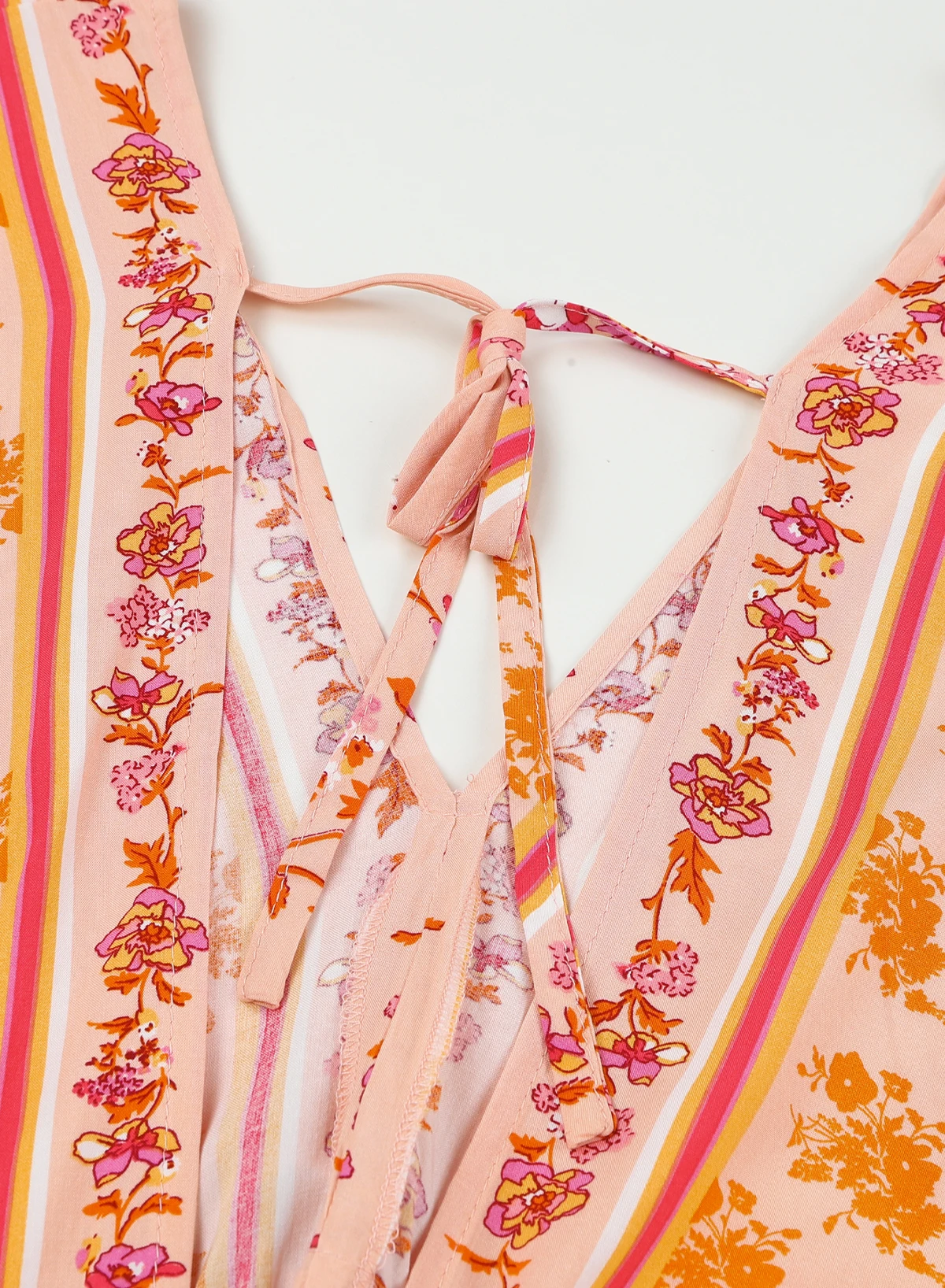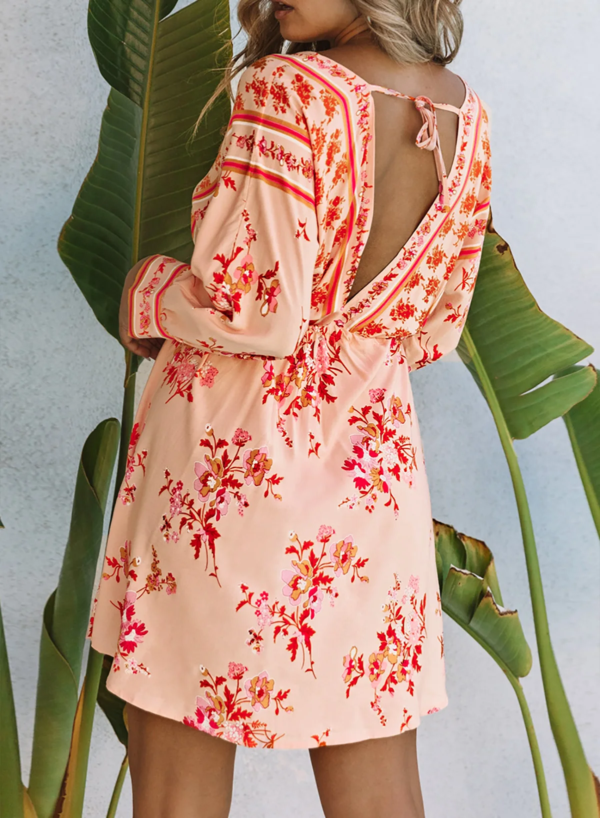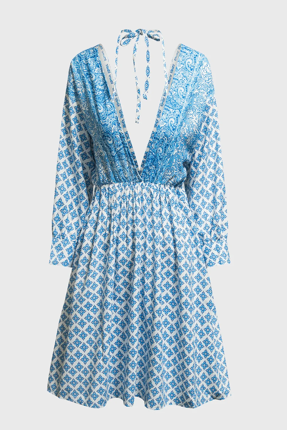 Multicolour V Neck 3/4 Sleeve Bohemian Vintage Print Mini Dress