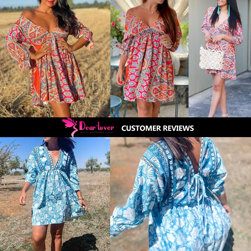 Dear-Lover Summer Wholesale Vestido Women Vintage Floral Printed V Neck Cut Out Ruffle Lady Mini Bohemian Boho Dress
