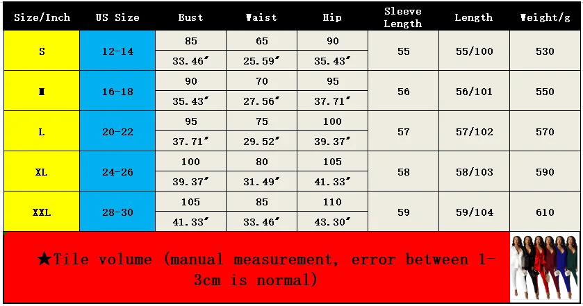 There is 2~3cm error range difference due to manual measurement. 1 inch = 2.54 cm 1 cm = 0.39 inch Please check the measurement chart carefully before you buy the item. Please note that a slight color difference should be acceptable due to the light and screen | ||