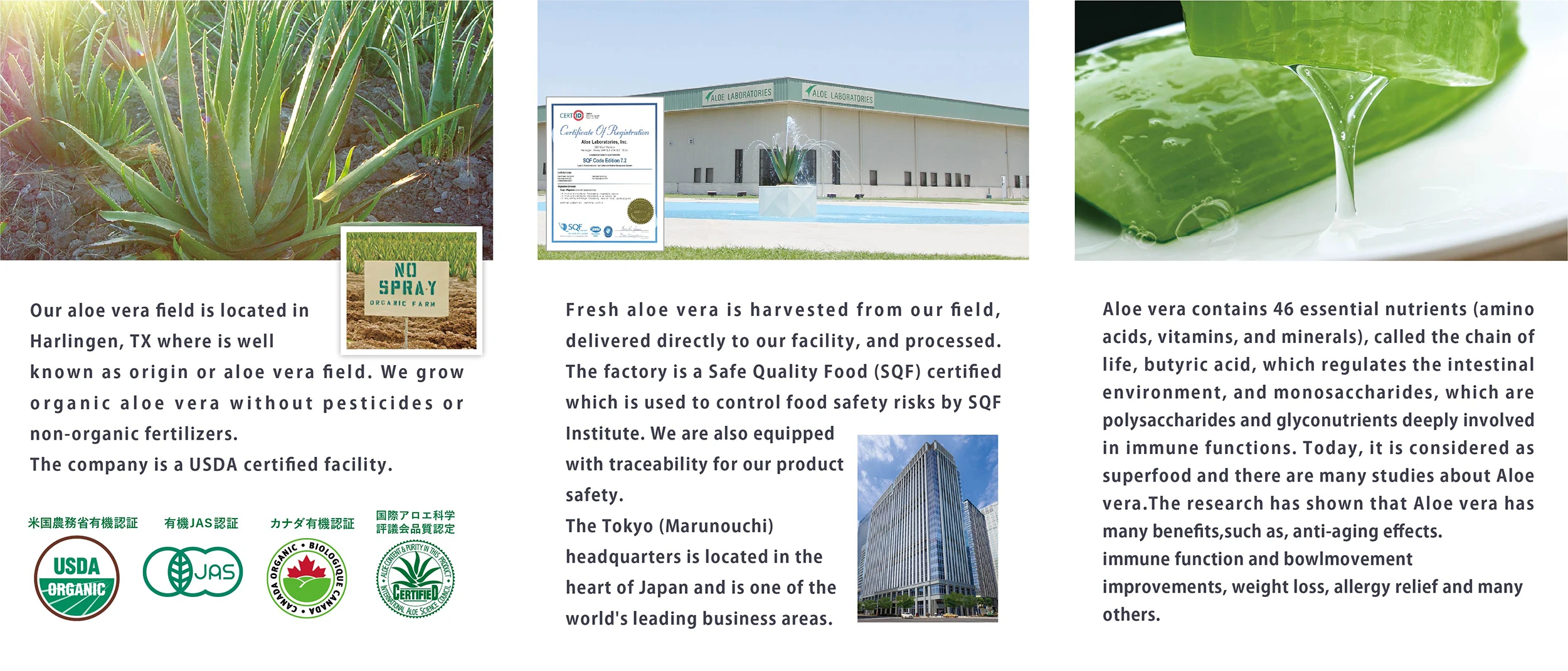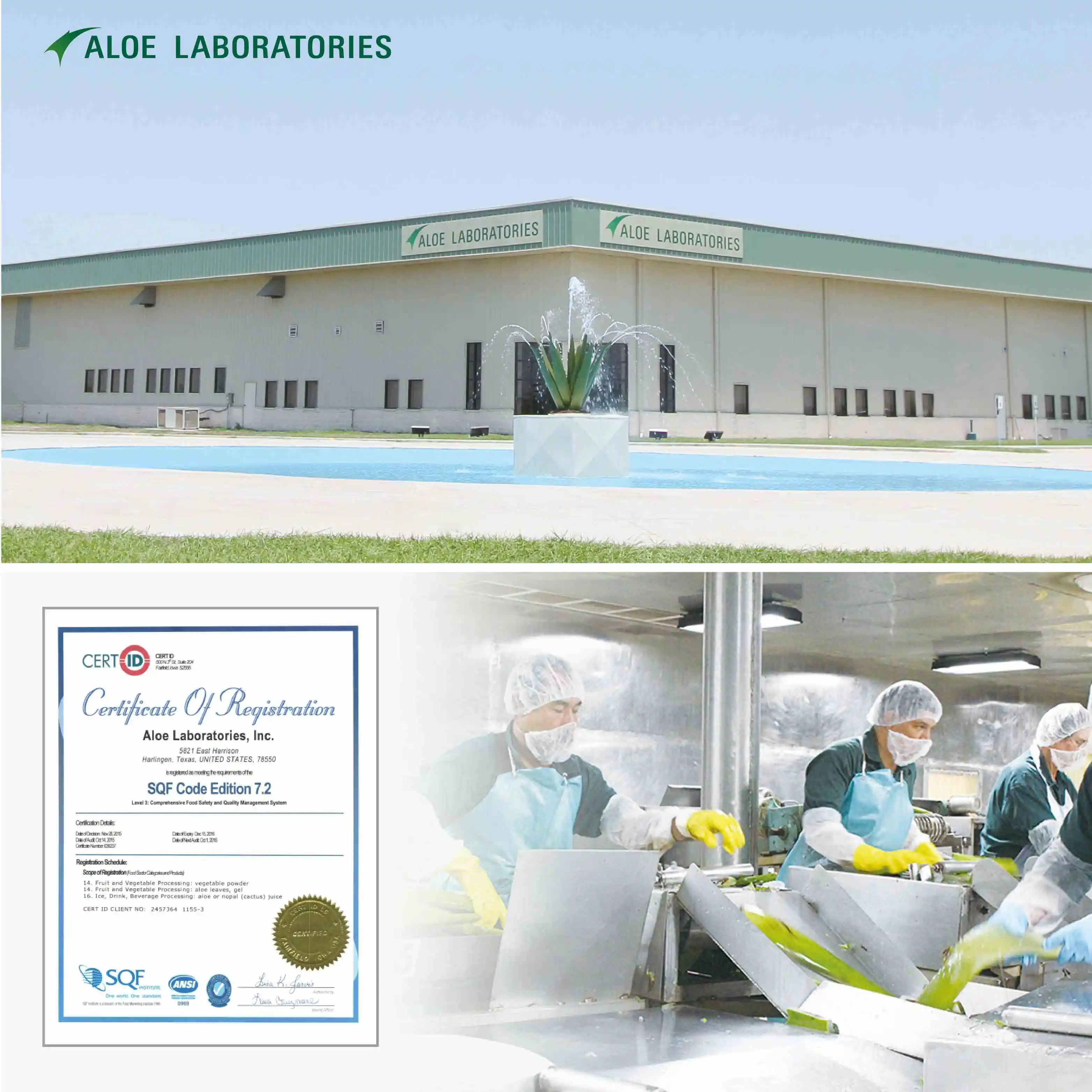 Fresh aloe vera is harvested from our field, delivered directly to our facility, and processed. The factory is a Safe Quality Food (SQF) certified which is used to control food safety risks by SQF Institute. We are also equipped with traceability for our product safety.