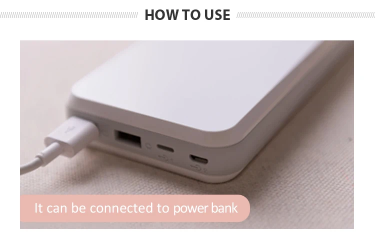 b. Removeable USB cable, can be connected with laptop or power bank. 5V safe voltage.