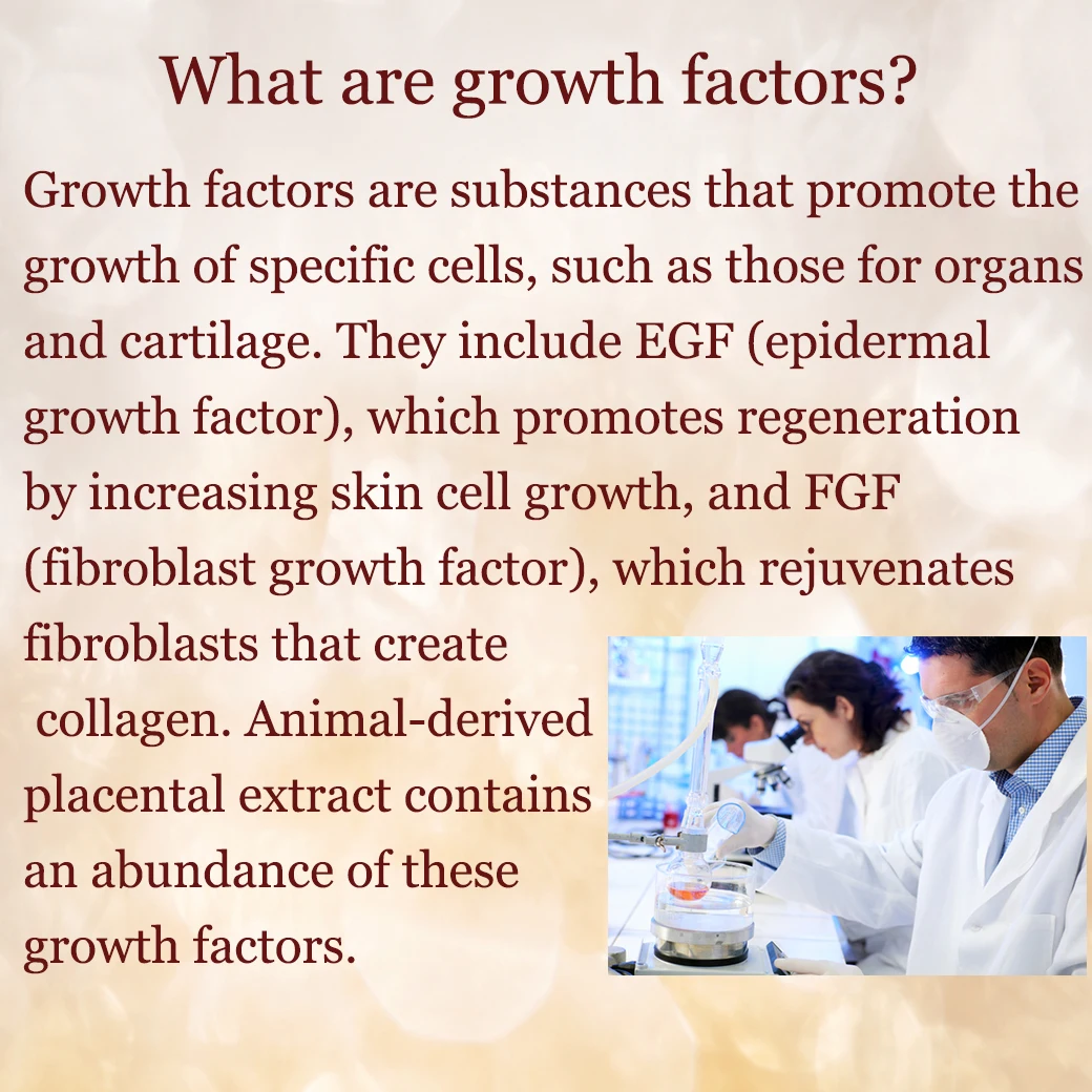 Growth factors are substances that promote the growth of specific cells, such as those for organs and cartilage. They include EGF (epidermal growth factor), which promotes regeneration by increasing skin cell growth, and FGF (fibroblast growth factor), which rejuvenates fibroblasts that create collagen. Animal-derived placental extract contains an abundance of these growth factors.