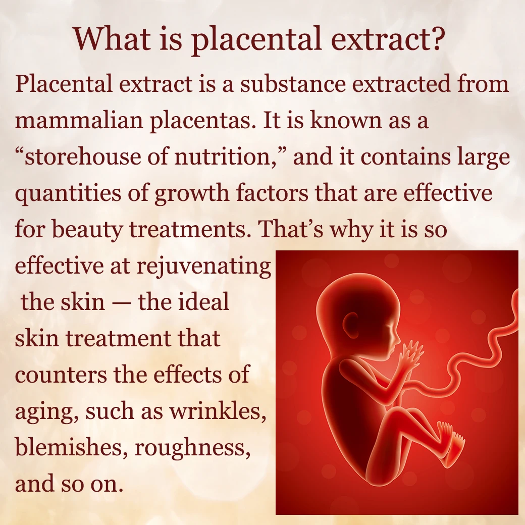 Placental extract is a substance extracted from mammalian placentas. It is known as a “storehouse of nutrition,” and it contains large quantities of growth factors that are effective for beauty treatments. That’s why it is so effective at rejuvenating the skin — the ideal skin treatment that counters the effects of aging, such as wrinkles, blemishes, rough-ness, and so on.