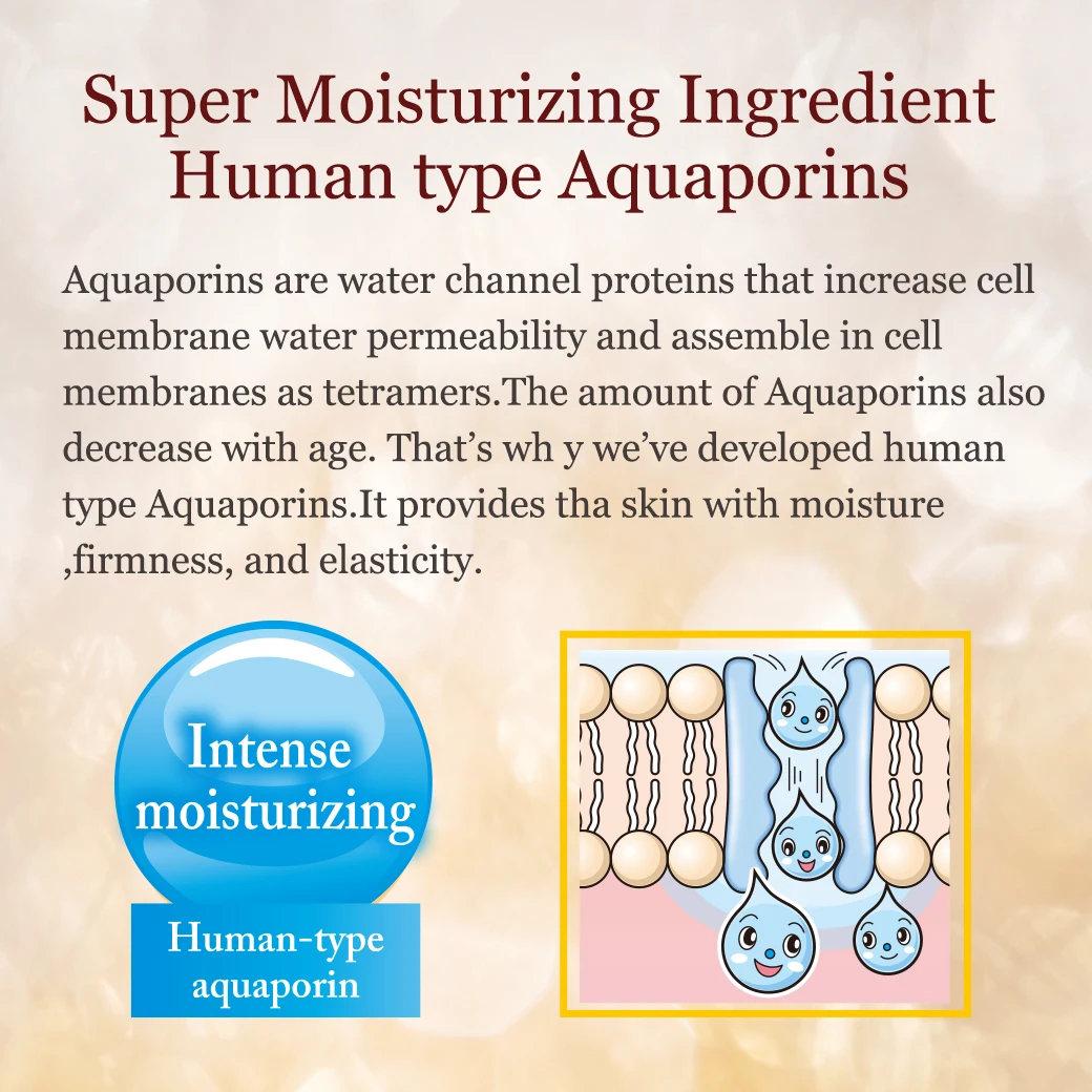 Moisturizing lotion that provides firmness and elasticity This skin lotion contains human-type placenta, EGF, IGF-2, aFGF, and TRX as well as human-type aquaporin, a moisturizing ingredient. It also contains the beauty ingredients hyaluronic acid, licorice extract, carrageenan, and Amur cork tree bark extract. It provides the skin with moisture, firmness, and elasticity.