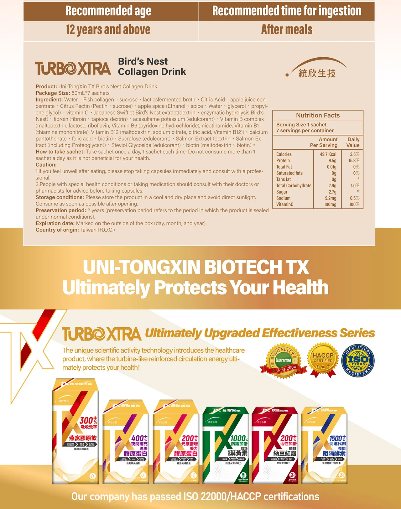 Tongxin was founded in Tainan more than a decade ago and is committed to nurturing R&D professionals. Not only do we merge eastern and western medical practices to offer versatile care for the Asian constitution, but we also have developed a complete R&D production line and industrial-academia cooperation in order to achieve patented technologies. We were presented with the Taiwan Enterprise Award, which is the utmost honor in the business, and we are qualified for ISO22000 and HACCP. Our secure, convenient, and scientific products are nothing but reliable.