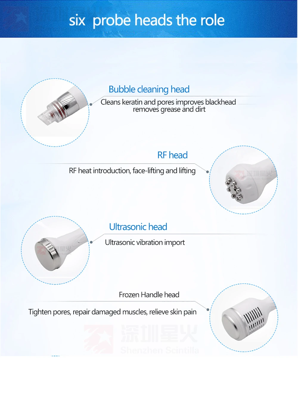RF Lifting Head: Lifts and tightens skin, stimulates collagen and improves contour drooping.