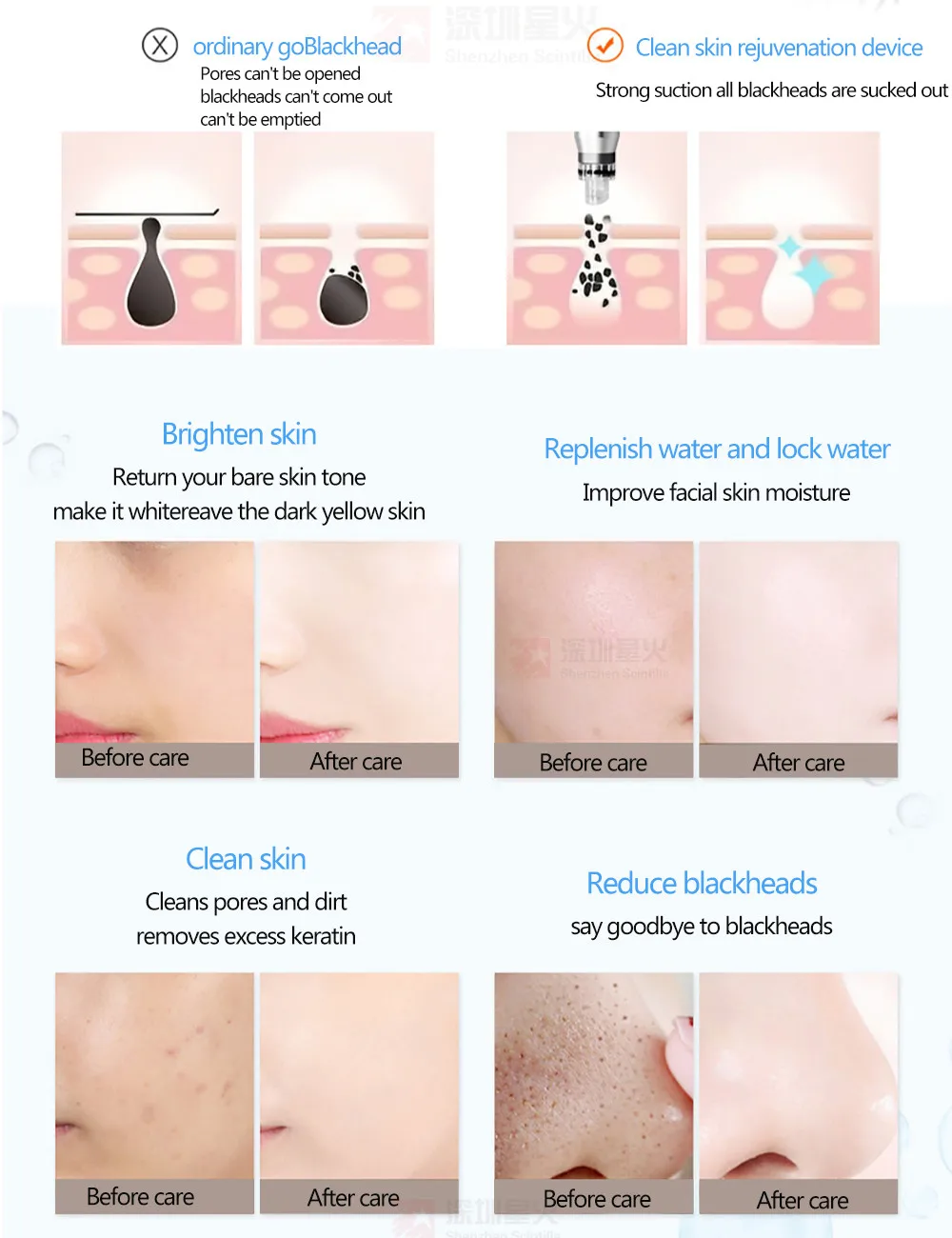 Cold Hammer Whitening Head: Calms, whitens and rejuvenates the skin, shrinks pores, removes redness, reduces sensitivity and improves dark yellow skin.