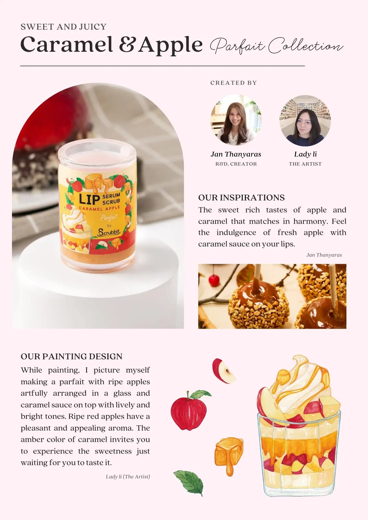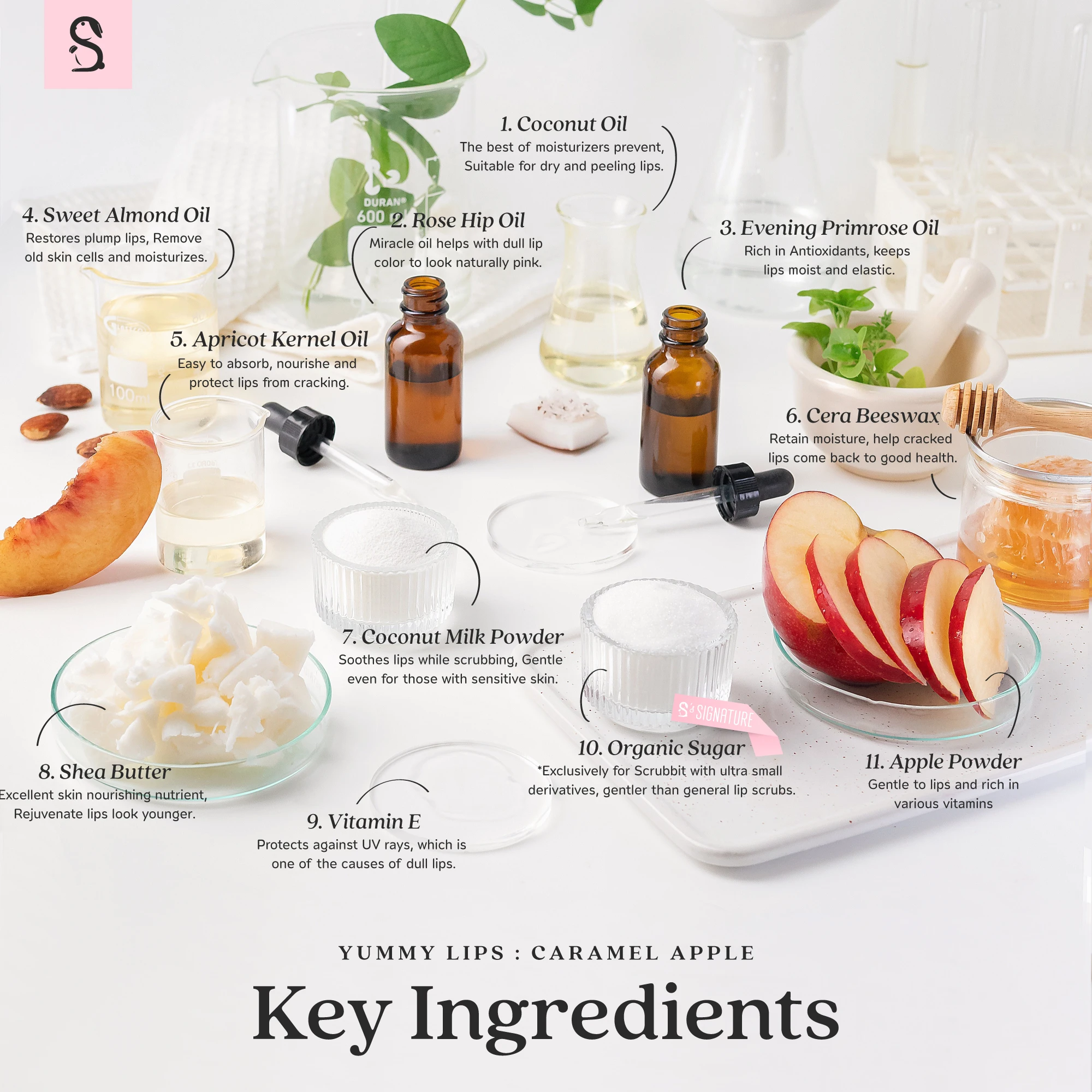 Ingredient | Rose Hip Oil, Evening Primrose Oil, Apricot Kernel Oil, Sweet Almond Oil, Coconut Oil, Shea Butter, Cetyl Alcohol, Cera Alba, Polyglyceryl-3 Beeswax, Stearic Acid, Tocopheryl Acetate (Vitamin E), Flavor Oil, Mineral Pigment, Lip Scrub: The same ingredients as above in addition to Organic Sugar, Coconut Milk Powder, Apple Powder |