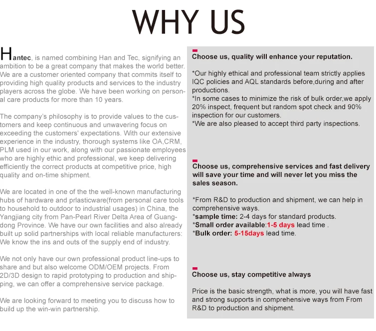 A: We’ve found that a lot of customers from Alibaba are new in personal care tools field. Don’t worry as we have good experiences to handle that, for example we can send you some packages for your reference, or you just need to give us some ideas or just some pictures of what you need, we will offer you professional solutions.