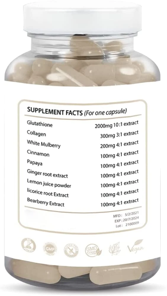 Function | Skin Whitening, Anti-aging, Anti-wrinkles, Remove freckles & dark spots 【 Age is Just a Number 】- Our collagen & glutathione supplement has a potent blend of 6200 MG per serving (2 capsules) which fights against the aging effects and makes your skin look younger, glowing, and wrinkle-free. 【 Ideal Skin Lightening Ingredients 】- Our skin whitening pills are made using a unique combination of 100% natural ingredients such as; Glutathione, Collagen, White Mulberry, Cinnamon, Papaya, Ginger Root, Lemon Juice Powder, Licorice Root, and Bearberry. 【 Get Your Glowing Skin Back 】- While other skin brightening pills are chemically manufactured and leave harmful side effects; our is organically originated using antioxidant formula, which gets rid of dark spots, acne scars, dullness, wrinkles, and fixes discoloration and pigmentation. 【 Many Skins One Solution 】- Our gluthathione super lightening capsules works well on all types of skins, which means no more frustration of which capsule to choose and which to drop 【 High-Quality 】- 100% Plant-based, non-GMO, contains no fillers, and manufactured while following strict GMP safety regulation; we believe in quality, and our customers will get the result that they are expecting. |