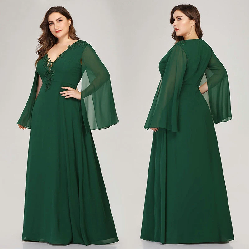 Plus Size Green Evening Dresses A-Line V-Neck Appliques Elegant Women Formal Dresses