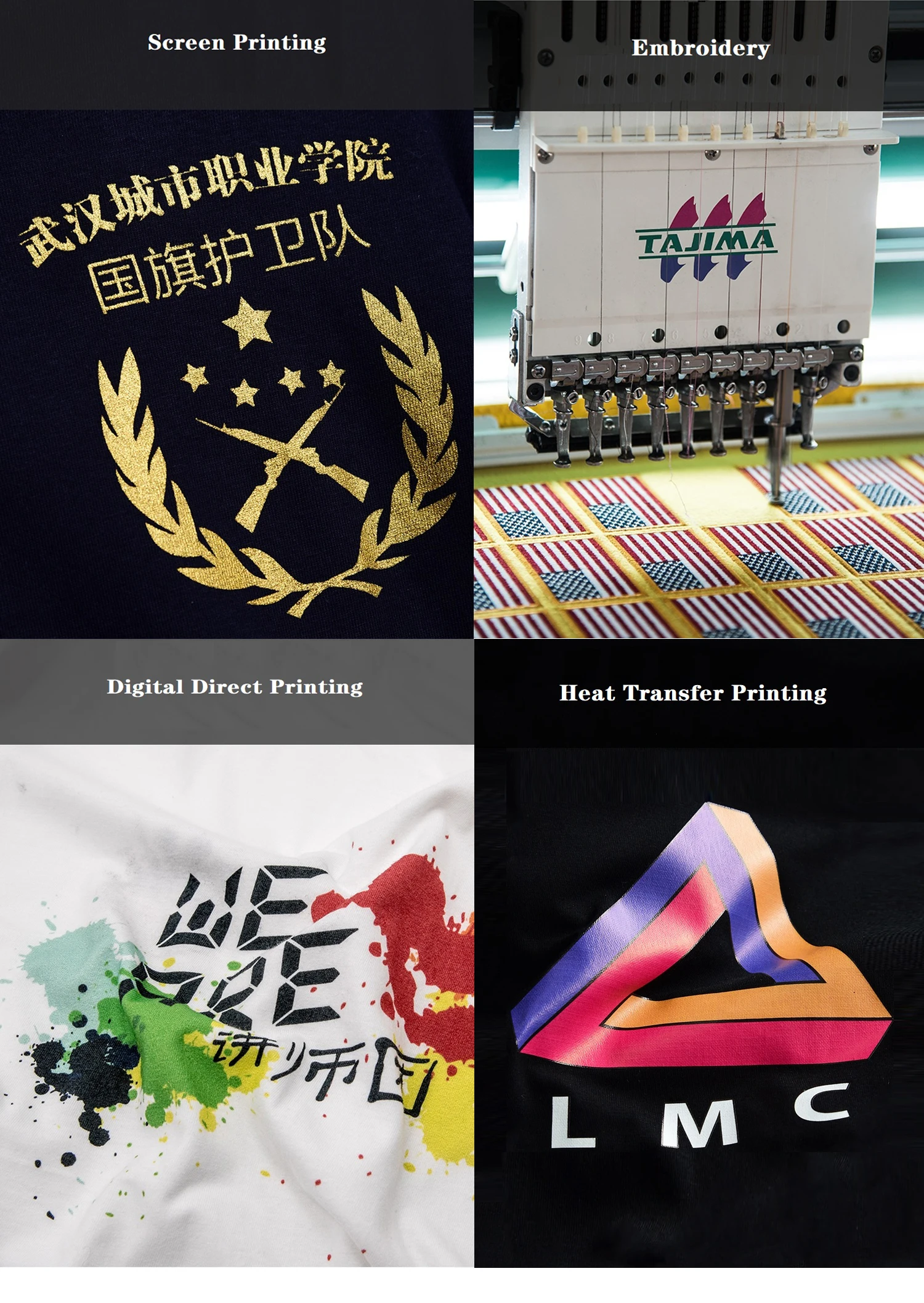 We have advanced printing and dyeing technology, heat transfer printing, scree printing, direct digital printing, Embroidery...