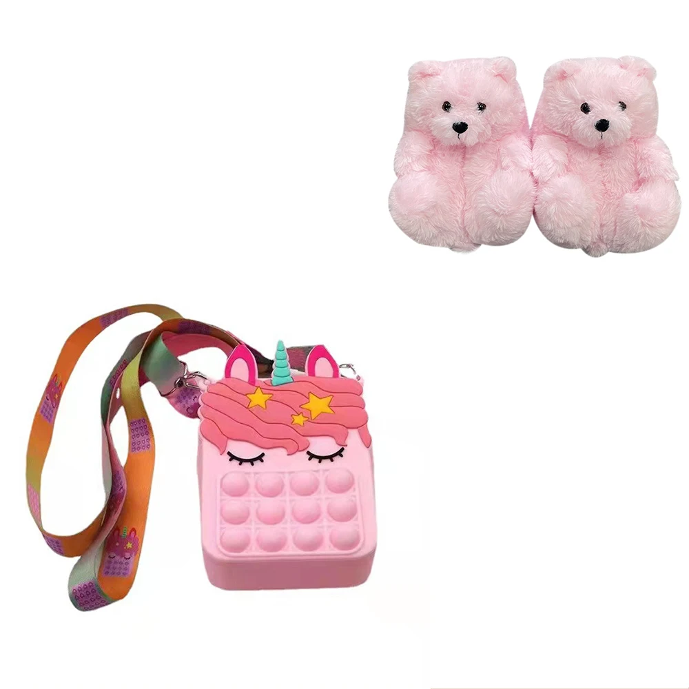 Silicone Cute Kids Bag Teddy Bear Matching Plush Slippers Set Children Kids House Shoes Coin Purse and Handbags