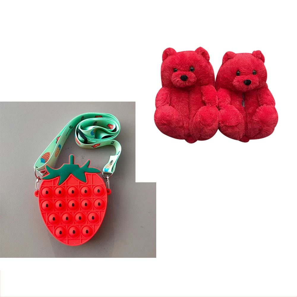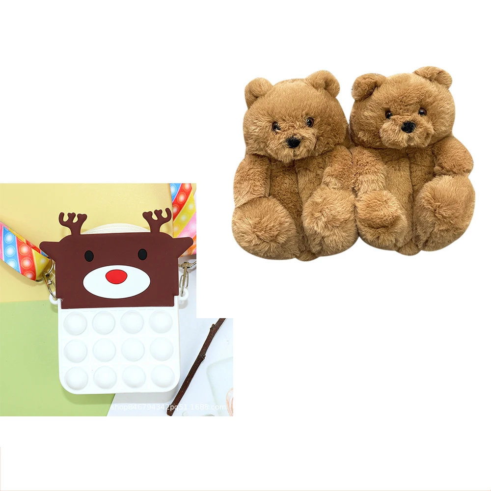 Silicone Cute Kids Bag Teddy Bear Matching Plush Slippers Set Children Kids House Shoes Coin Purse And Handbags