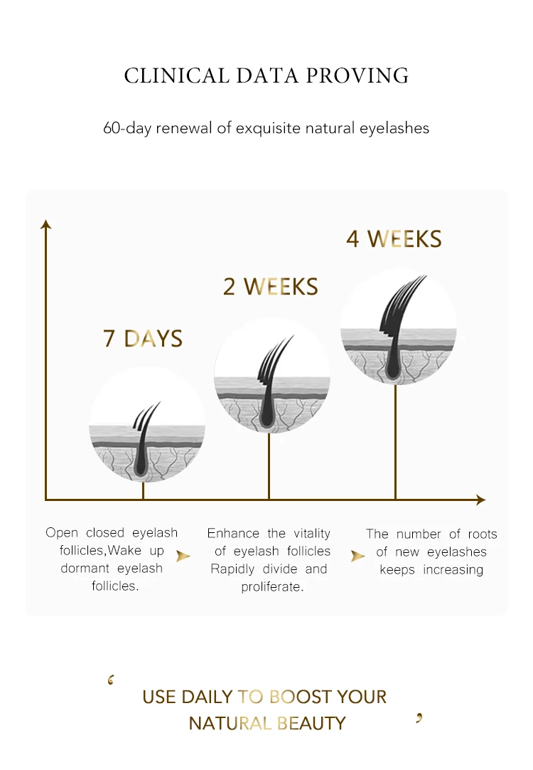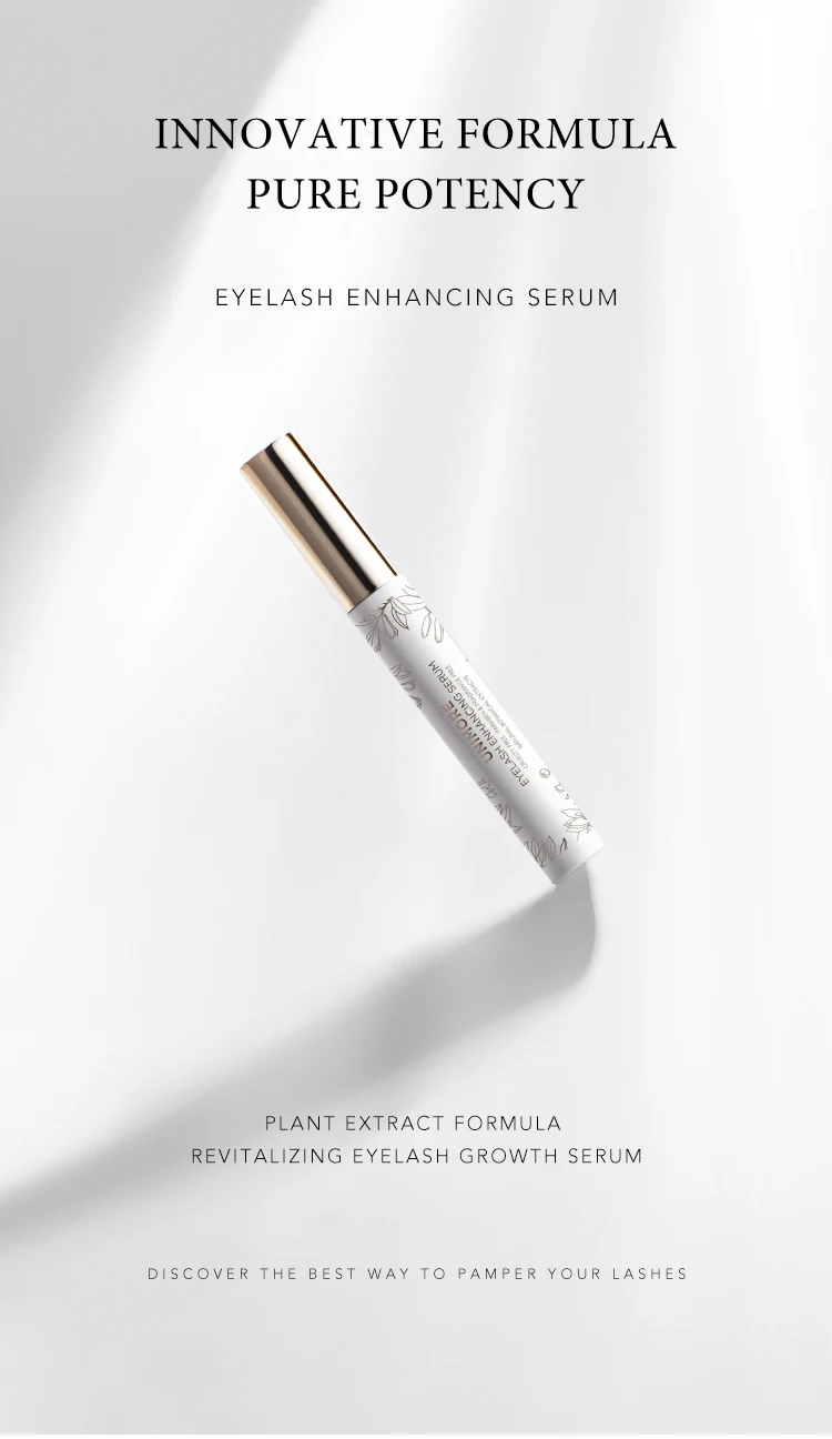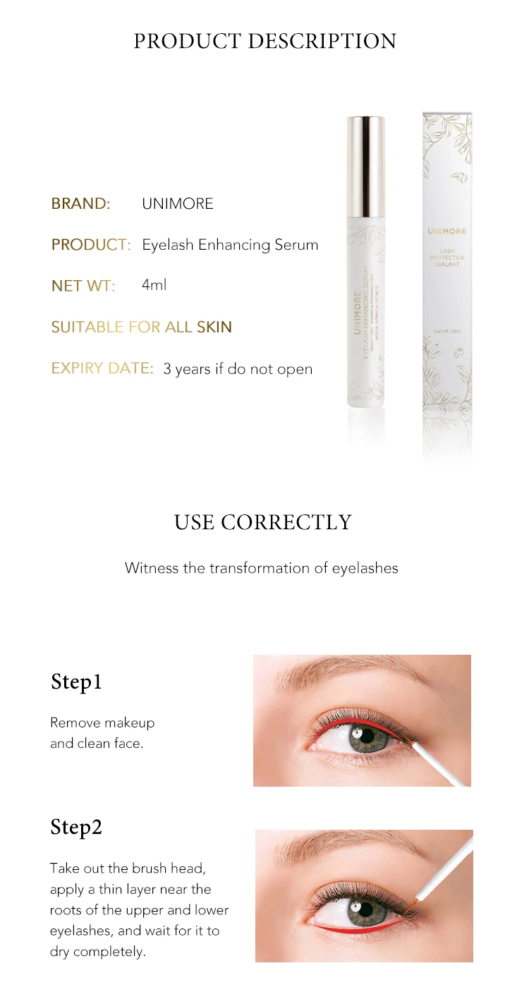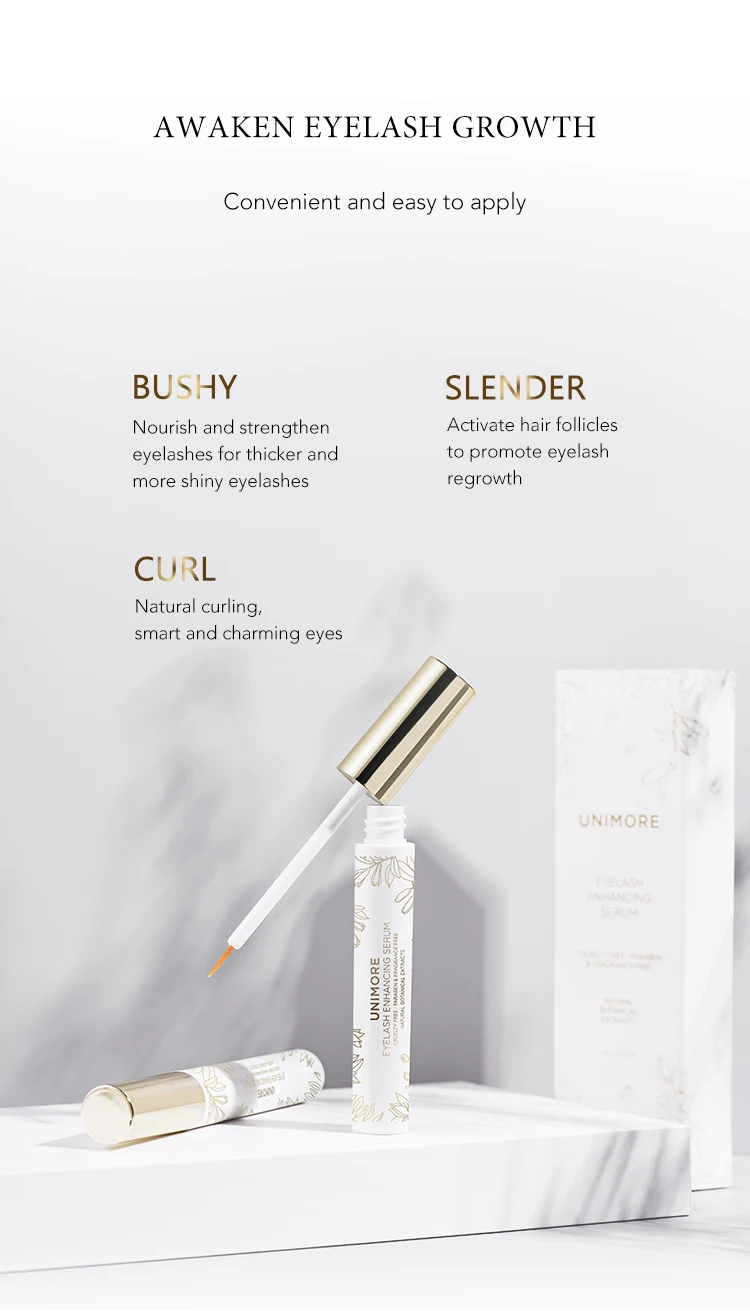 Unimore Eyelash enhancing serum Contains Myristoyl Pentapeptide-4 composition.Myristoyl Pentapeptide-4 is a signal peptide targeting keratin, which can stimulate the expression of human keratin gene to produce more keratin, thus promoting the growth and enlargement of eyelashes.The Myristoyl Pentapeptide-4 and botanical ingredients combined action of the components promotes the vitality and growth of eyelashes and improves resistance to the growth of existing eyelashes and the regeneration of new eyelashes. Over 6 weeks of daily use saw a 55% increase of natural eyelashes.Eyelash growth can be seen after 15 days of use in the morning and evening.Use daily and let eyelash serum show magical effects.