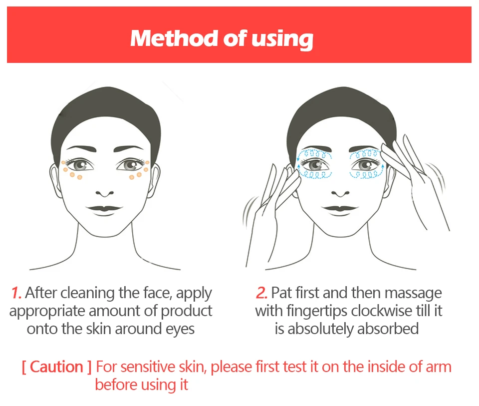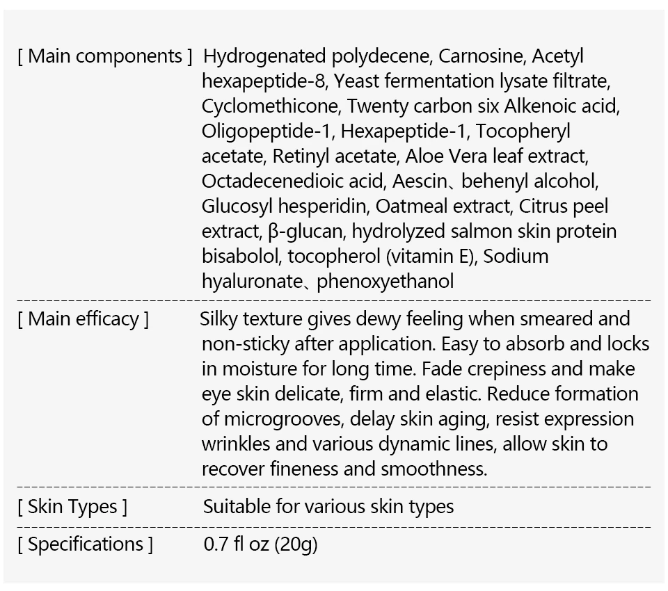 [ Main components ] Hydrogenated polydecene, Carnosine, Acetyl hexapeptide-8, Yeast fermentation lysate filtrate,Cyclomethicone, Twenty carbon six Alkenoic acid,Oligopeptide-1, Hexapeptide- 1, Tocopherylacetate, Retinyl acetate, Aloe Vera leaf extract,Octadecenedioic acid, Aescin. behenyl alcohol,Glucosyl hesperidin, Oatmeal extract, Citrus peelextract, glucan, hydrolyzed salmon skin proteinbisabolol, tocopherol (vitamin E), Sodiumhyaluronate phenoxyethanol [ Main efficacy ] Silky texture gives dewy feeling when smeared and non-sticky after application. Easy to absorb and locksin moisture for long time. Fade crepiness and makeeye skin delicate, firm and elastic. Reduce formationof microgrooves, delay skin aging, resist expressionwrinkles and various dynamic lines, allow skin torecover fineness and smoothness. [ Skin Types ] Suitable for various skin types [ Specifications ] 0.7 fl Oz (20g)