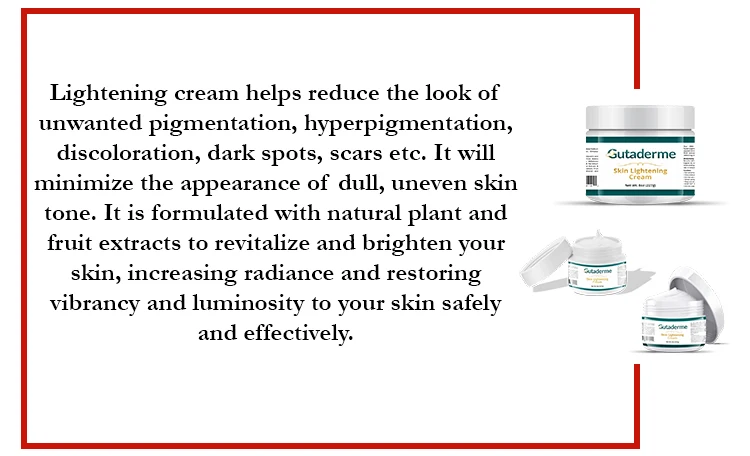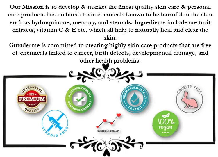 4. why should you buy from us not from other suppliers? Our Mission is to develop & market the finest quality skin care & personal care products has no harsh toxic chemicals known to be harmful to the skin such as hydroquinone, mercury, and steroids. Ingredients include are fruit extracts, vitamin C & E etc. which all help to naturally heal and clear the skin. Gutaderme is committed to creating highly skin care products that are free of chemicals linked to cancer, birth defects, developmental damage, and other health problems.