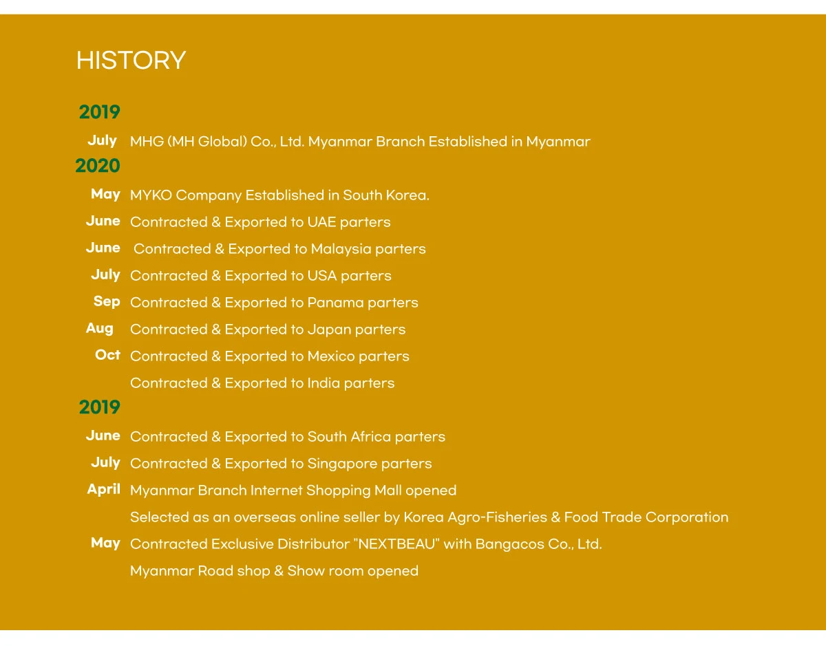 All Korean products : cosmetics, beauty, foods, K-pop item, fashion, garments & bags, stock items, etc.All Myanmar products : agriculture & sea foods, typical hand crafts, accessories, rattan furniture, gem stone, raw materials, etc.