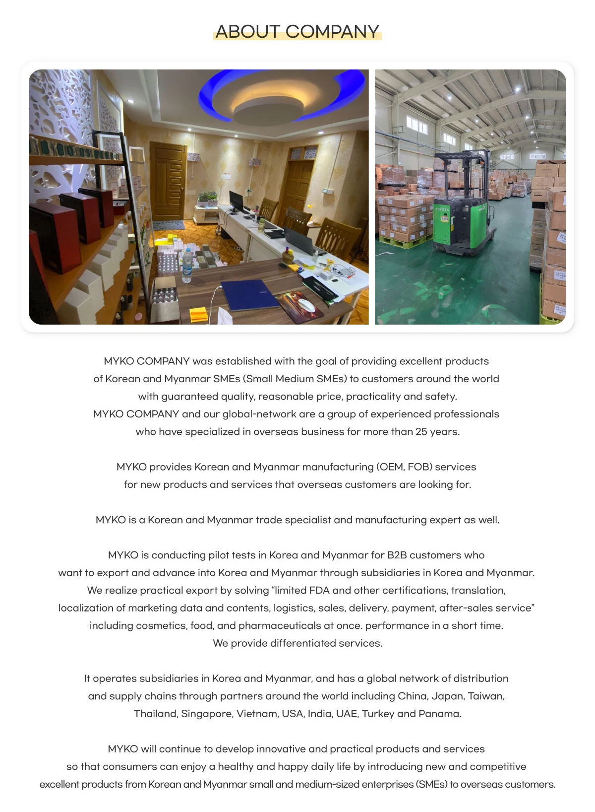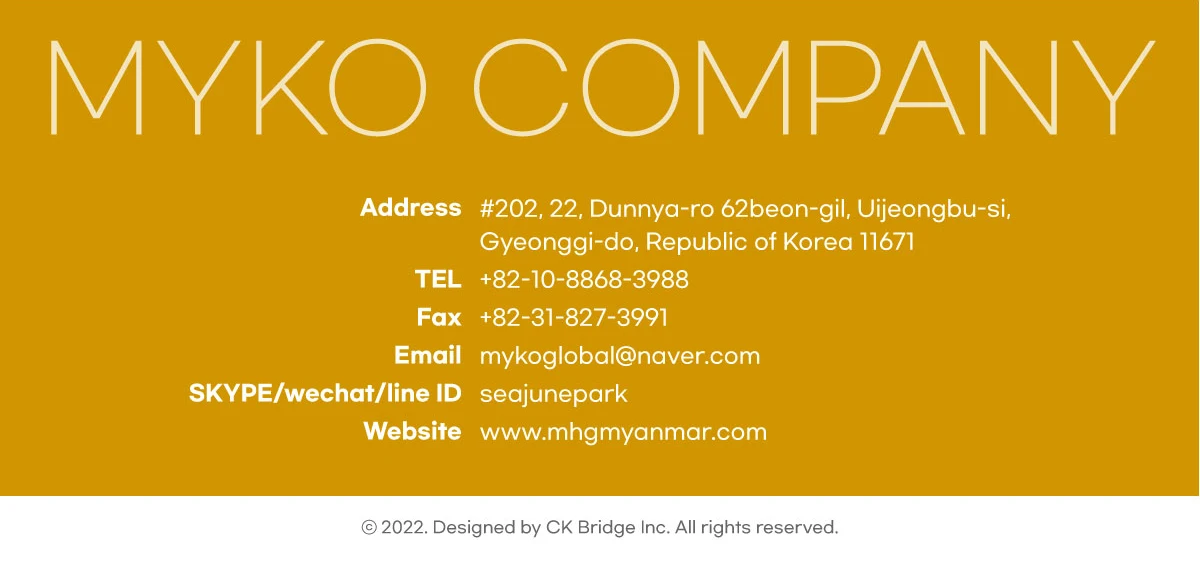 We are based in South Korea and Myanamar, started from 2018,Export areas is North America, Mid East, Europe, Central America,