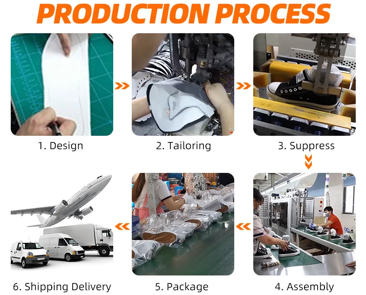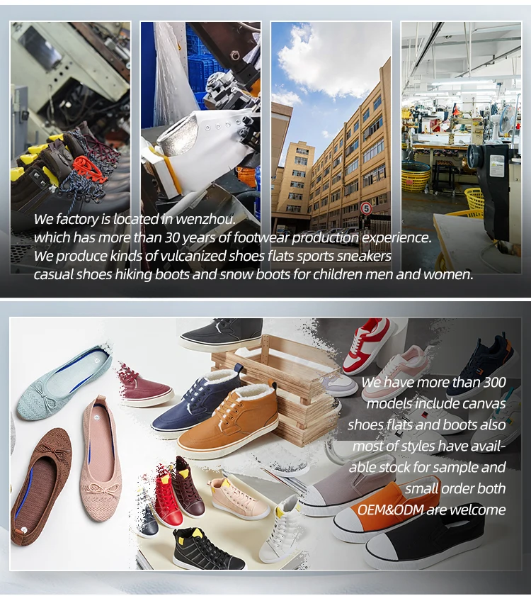 Q1: What's the capacity of your factory ? A1: Our factory area is up to 12200 square metre with more than 600 workers ,and there is 4 production lines that can produce 8000000 pairs of shoes per year Q2: How long does it take to produce an order? A2: It depends on the style and quantity of the shoes and can be confirmed with the salesperson. About 15-20 days for 300 pairs of canvas shoes after confirming all details. Q3; What kind of shoes can we produce ? A3: Canvas Shoes, Fashion Sneakers, Flat, Boots, Slippers